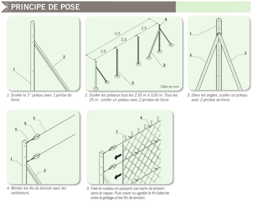 Les poteaux en fer de type T sont munis de trous facilitant la pose du fil de tension ainsi que l'installation d'une jambe de force en L. Ils sont parfaitement compatibles avec les grillages en rouleau, en particulier le grillage simple torsion.